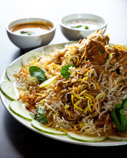 His Hyderabadi Dum Biryani, layered with fragrant basmati rice, tender marinated meat, and saffron